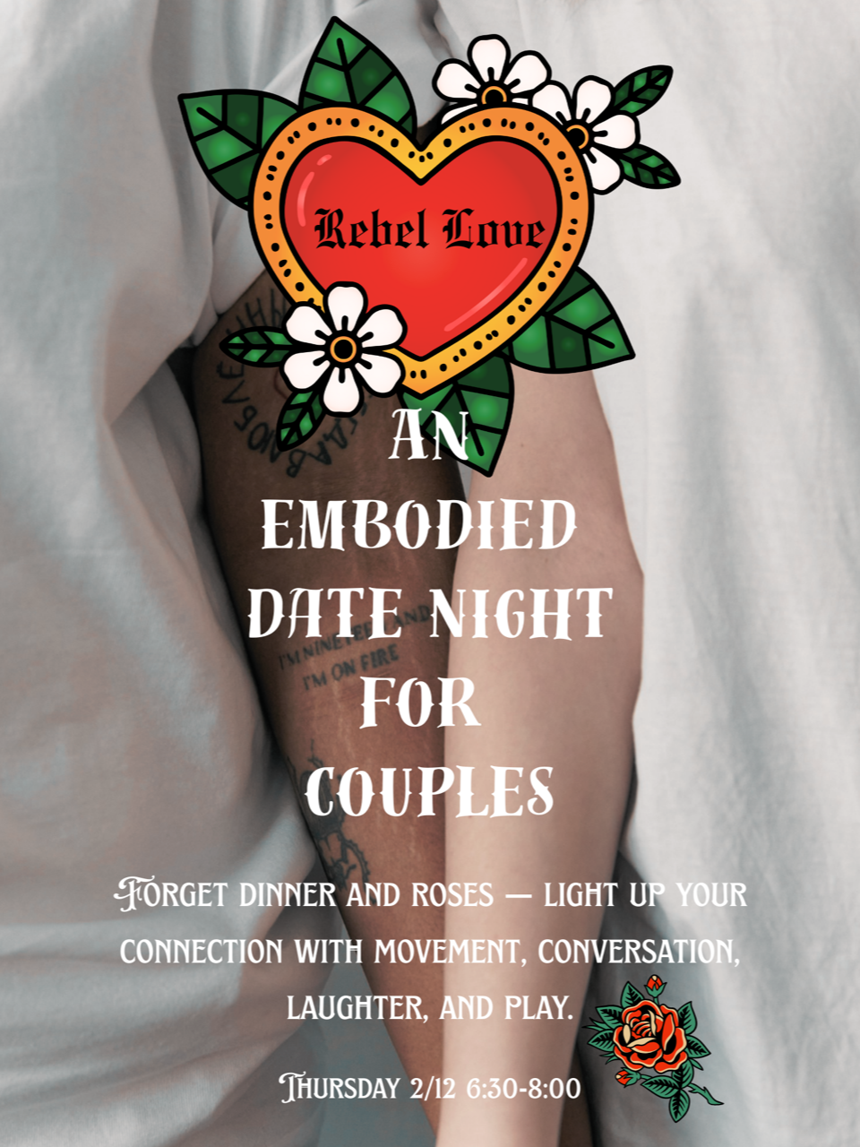 Rebel Love is a 90-minute Rebel Wellness relationship reset — a playful, soulful, and body-centered evening designed to help couples reconnect through presence, communication, and creative energy.